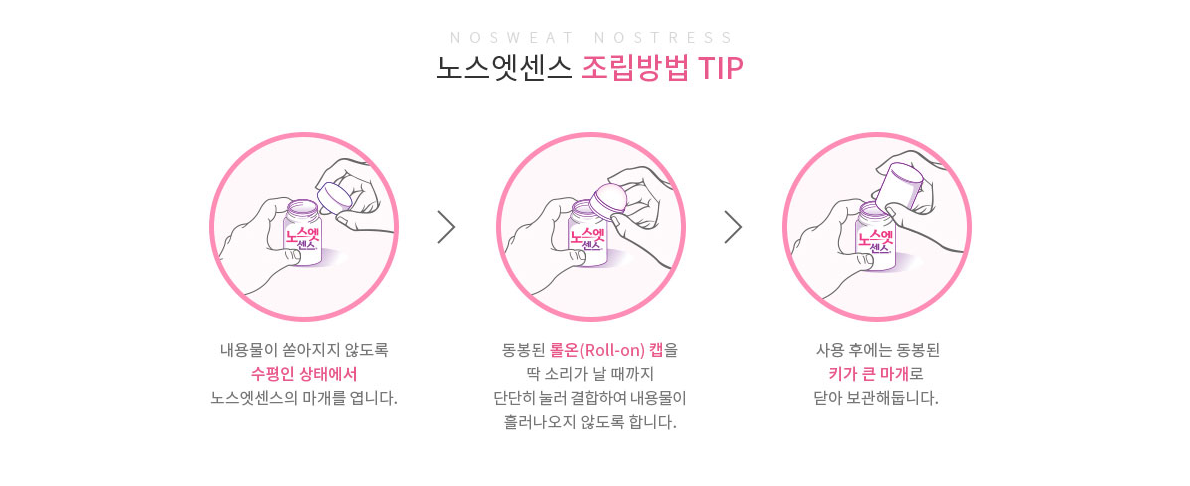 노스엣센스를 개봉하고, 마개를 둥근 롤온(Roll-on) 캡으로 변경해주세요. 내용물이 흘러나오지 않도록 단단하게 조여주세요. 이후 평소 보관하실 때는 큰 마개로 바꾸어 닫아 보관해주세요.