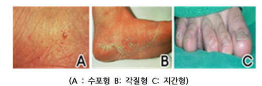 - 발가락, 발바닥, 뒤꿈치에 작은 물집이나 농포가 많이 생긴다.