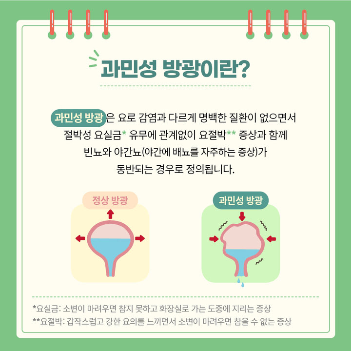과민성방광은 요로감염 같은 뚜렷한 원인이 없는데도, 절박성 요실금(의지와 상관없이 갑자기 소변이 나옴) 혹은 요절박 (강하고 갑작스러운 소변 욕구를 느끼며 참을 수 없음) 증상과 함께 빈뇨, 야간뇨가 있는 경우를 말합니다.