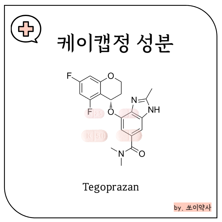 케이캡정의 주성분인 테고프라잔(tegoprazan) 위산 분비를 줄여주는 성분이에요.